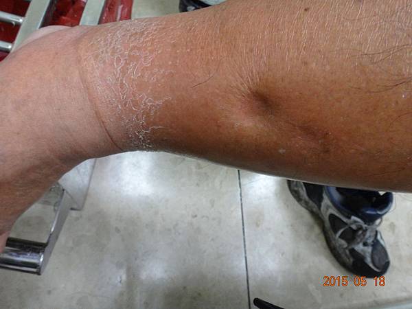 這些患者因為靜脈不全(CVI),有些會合併兩腳下肢水腫(如圖10),尤其到傍晚會更嚴重,但剛起床時,腫又消了,有的或許會合併潰瘍(如圖11),嚴重的話會流湯 (weeping,如圖12),並伴隨嚴重疼痛症狀,如前一篇所述,鬱滯性皮膚炎在剛開始急性期時,也可能會有發炎等症狀,表現出紅腫熱痛,但以抗生素治療一星期卻不見改善(如圖13),或者症狀在就診時已持續數星期,此時需考慮鬱滯性皮膚炎的急性期表現,建議腳抬高避免久坐久立、配合彈性繃帶(彈繃,elastic bandage)治療,可抽血驗CBC/DC,CRP來排除蜂窩性組織炎。