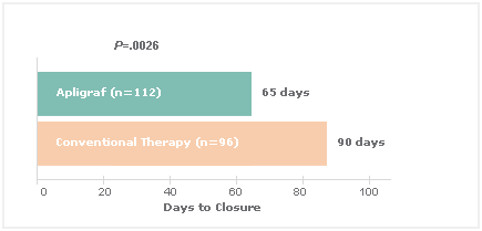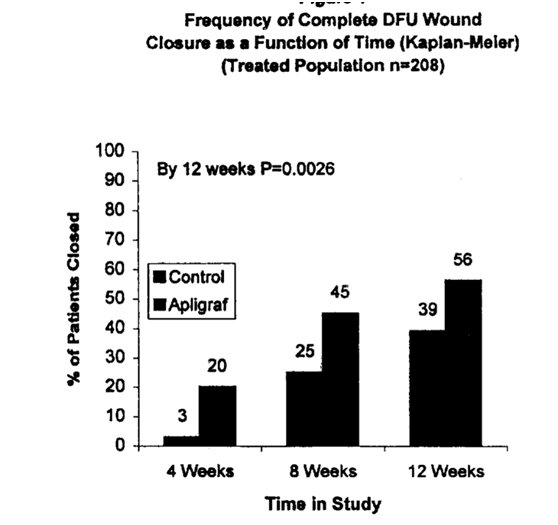 根據FDA的資料2,organogenesis公司收集了208個糖尿病足部傷口患者,112個使用apligraf,96個使用標準治療,傷口大小為0.4-16.3平方公分,平均為2.97±3.10平方公分,患者接受12個星期的治療,及之後3個月的追蹤,apligraf這組於第0天,第1、2、3、4週時,若敷料以無法100%覆蓋傷口,則會追加在補充一塊apligraft,最多給5塊敷料,敷料外用濕紗布覆蓋,再以乾紗布包紮。對照組則只以濕紗布填塞。一天換兩次藥。並都做好off-loading。結果,實驗組中有超過一半需使用5塊apligraf,但平均使用3.9塊,平均65天癒合,12週時癒合率為56%,對照組則平均90天癒合,12週時癒合率為39%(表1,圖1,2),這個研究報告之後於2001發表於diabetic care期刊3(Apligraf 舊稱Graftskin)。