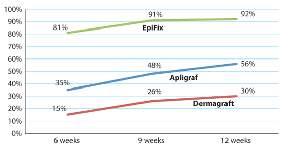 圖3. Rates of complete healing at 6, 9, and 12 weeks for Apligraf, Dermagraft, and EpiFix groups