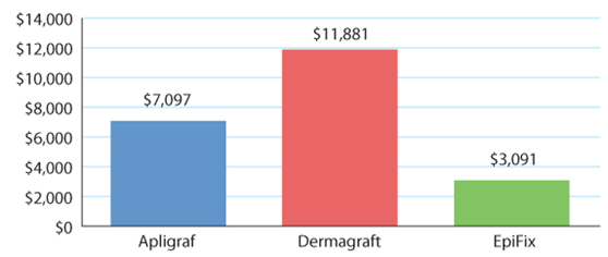 結果Apligraf(n=112),Dermagraft(N=130), EpiFix(n=64)三組傷口大小都差不多2-3平方公分,但是…..