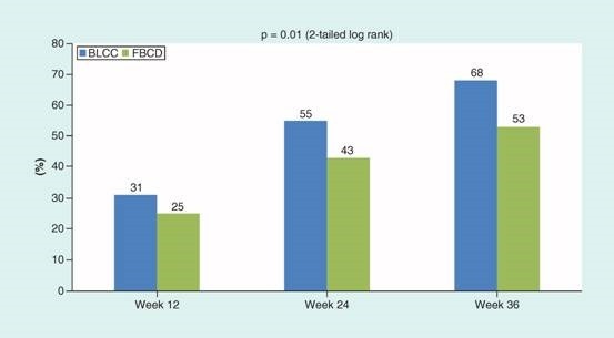我們再來看另一個今年發表的研究3,其比較Apligraf及Primatrix這兩種從動物的膠原蛋白做出的敷料對於靜脈性潰瘍的比較,根據前文,PriMatrix其實原始的老闆也是發明Apligraf的Eugene Bell,只是於2015年賣給了Integra LifeSciences公司4,這次的比較,算是『煮豆燃豆萁』吧,PriMatrix是由『胎牛』的真皮去細胞萃取而成acellular fetal bovine collagen dressing (FBCD),屬於一種ADM(Acellular Dermal Matrix),但因不是從人類身上取得,故不需符合21 CFR 1271的HCT/Ps,而是需通過FDA 510(k)審核,但這類膠原蛋白產品要通過510(k)其實非常容易,只要證明和目前現有已上市class II產品相同有效及安全即可5,因為膠原蛋白敷料(如台鹽的skintemp, medifil)collagen dresssing很早就被運用於傷口上,會將matrix metalloproteinases (MMPs,基質金屬蛋白酶,其會抑制傷口生長) 抑制吸收、止血、促進生長, 所以這一類的產品適應症很廣,都同樣是1. Partial and full thickness wounds 2. Pressure, diabetic, and venous ulcers 3. Second-degree burns 4. Surgical wounds—donor sites/grafts, post-Moh’s surgery, post-laser surgery, podiatric, wound dehiscence 5. Trauma wounds —abrasions, lacerations and skin tears 6. Tunneled/undermined wounds 7. Draining wounds,但對牛製產品或膠原蛋白過敏不能用,不列在適應症中的,如『第三度燙傷』則都為禁忌症6。至於『胎牛』的來源,在關懷生命協會網站有寫到『一些母牛在被群體送往屠宰場前懷孕,而母牛群平均年齡約兩歲時,會被集體送往屠宰場,所以,對農場主人來說,母牛是否懷孕並不重要。一旦到了屠宰場,包括懷孕的母牛在內,所有的母牛都會被屠宰。當屠宰場作業線在清除牛隻內臟時,可能會發現胎兒。如果屠宰場有足夠的設備,會迅速將整個生殖器官連同胎兒一併自母牛屍體內切除,並送往「小牛加工區」,在那裡進一步將胚胎自子宮中取出…』7,是有牽扯到動物實驗的道德問題,在此就BJ4了,PriMatrix其實是將此產品視為膠原蛋白支架(Scaffold),要當成房子吸引細胞長進去的,是要當成皮膚的長期覆蓋材,而不是作為補抓MMP,刺激傷口生長用的短期敷料。而再來看看Integra,其不是也是由牛韌帶的膠原蛋白為原料結合鯊魚軟骨合成,但是其就是反骨,堅決認為自己不是膠原蛋白敷料,而是創新的人工皮膚,故將自己當成第3類醫材申請FDA,於1996年終於拿到可以治療第3度燒傷的許可(離題了)。而Apligraf是由人類的真皮細胞養在牛膠原蛋白,結合第二層人的表皮細胞培養而成的雙層活細胞結構人工皮膚bilayered living cellular construct (BLCC),回到正題:作者收集805個靜脈潰瘍傷口以Apligraf治療,122個靜脈潰瘍傷口以PriMatrix治療,兩組傷口平均10cm2,都大於1年不癒合,Apligraf使用2.8 ± 1.6塊,約14天換一次,而PriMatrix使用2.1 ± 1.7塊,約21天換一次,結果Apligraf約19週癒合,而PriMatrix需30週(如圖1)。於第12週 (31.0 vs 25.0%), 第24週(55.0 vs 43%) 及第36週(68 vs 53%),Apligraf都有明顯的優勢(p = 0.01 ,如圖2),然而,和第一個實驗一樣,治療半年,平均使用3塊Apligraf,卻只有5成多的患者會癒合,至於PriMatrix的效果,則看起來和第一個實驗的標準治療對照組類似。