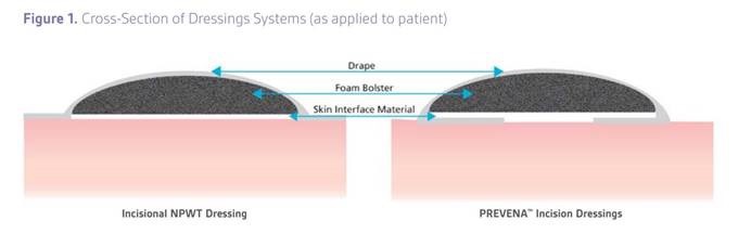 圖1.傳統的incisional NPWT dressing及Prevena incision dressing的比較,後者多了一層皮膚接觸層