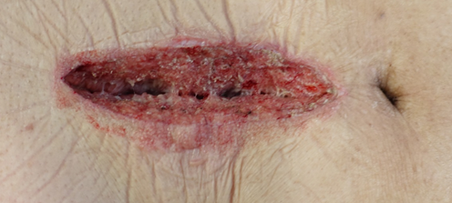 答案是,這傷口旁邊的紅是被傷口滲液浸潤導致,也就是說由吸飽滲液的潮濕泡棉長時間浸潤皮膚而來。因此解決的方法是,1.泡棉剪小一點,2.在傷口周圍用人工皮或薄膜覆蓋,以保護皮膚3.若滲液量不大,可用皮膚保護劑,如3M的Cavilon或康威的Silesse sting free skin barrier無痛護膜噴霧,或skin barrier wipe 4.或者可用泡棉敷料覆蓋在傷口周圍,以吸收水分,讓皮膚保持乾燥。