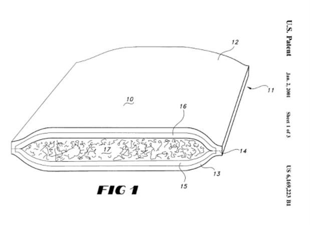 為解決gel blocking的問題,在這新專利上,包圍SAP的cellulose纖維素被改為紙纖不織布(Airlaid non-woven)。並且這美國專利的另一個改良特點就是在SAP中添加air laid紙纖不織布,一種可以吸水的不織布(圖2中的17,字藏在敷料中間),需儘可能均勻地將紙纖不織布與SAP混和,讓吸收性聚合物SAP粒子附著於纖維質基材上,藉由使SAP直接鍵結於親水性之基材上,而製造由基材導向SAP之水分通道,進而可發揮SAP本身之較高吸收倍率的吸收片(圖3)。敷料SAP下方內層是一層可吸水的紙纖不織布,用以固定SAP(圖2中的15),敷料SAP上方內層是一層PP或PE防水膜(圖1中的16),在其上下最外層則仍然為斥水性的PP編織布(圖2中的12,13)(圖4,5,6),這專利也說明了SAP主要成分是sodium polyacrylate或sodium polymethacrylate,非potassium polyacrylate,因後者會釋放出K離子,造成患者疼痛,而添加的液體也從生理食鹽水改為prefer林格氏液。而於敷料背面加了防水膜也就是1999年推出的TenderWet 24,可使用時間從12小時延長到24小時,這個專利並且把將於2004年出來的第二代便利包TenderWet@active也畫出來了(圖7)。